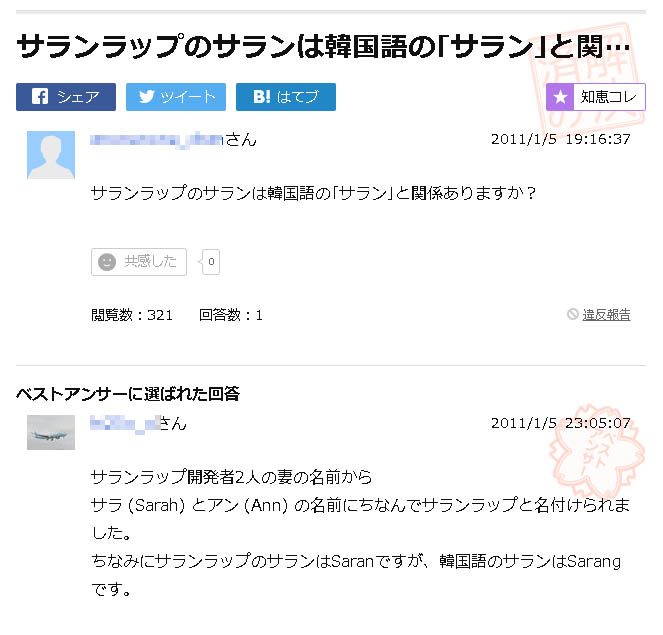 日本のヤフー知恵袋に上がって来た「「サランラップは韓国の商品なのか」についての質問